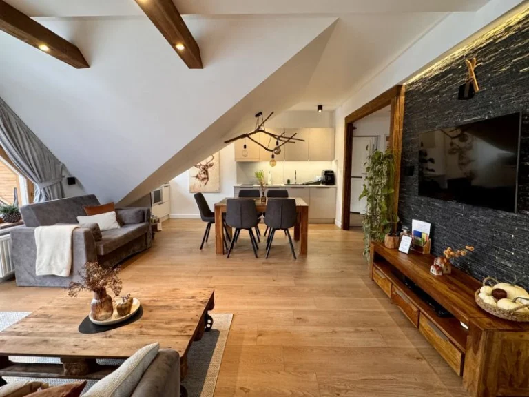 Wnętrze łączy nowoczesny styl z regionalnymi detalami. Eleganckie kolory, drewno i kamień tworzą wyjątkowy, zakopiański klimat w standardzie premium. -