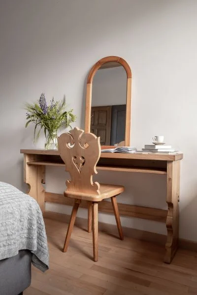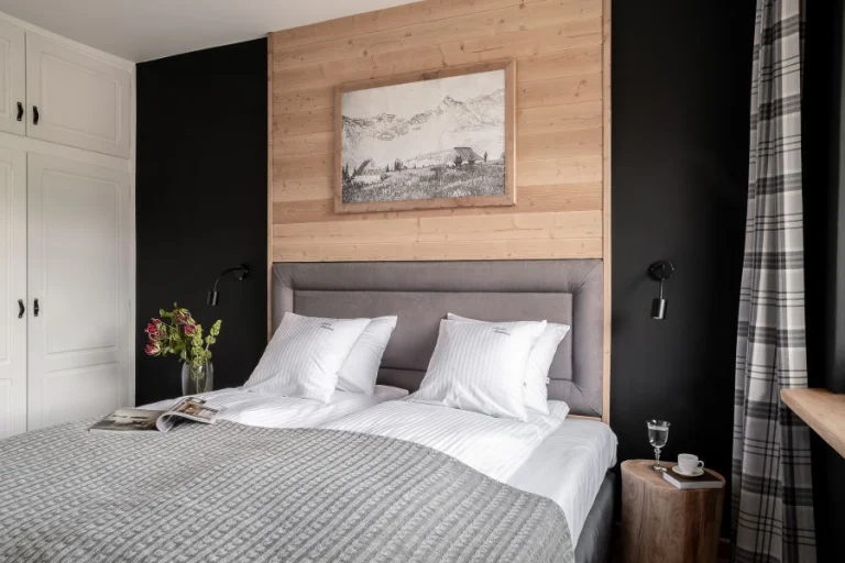Wystrój opiera się na naturalnym drewnie, ciekawych tapetach i przytulnych materiałach. Całość tworzy klimatyczne, górskie otoczenie idealne do wypoczynku. -