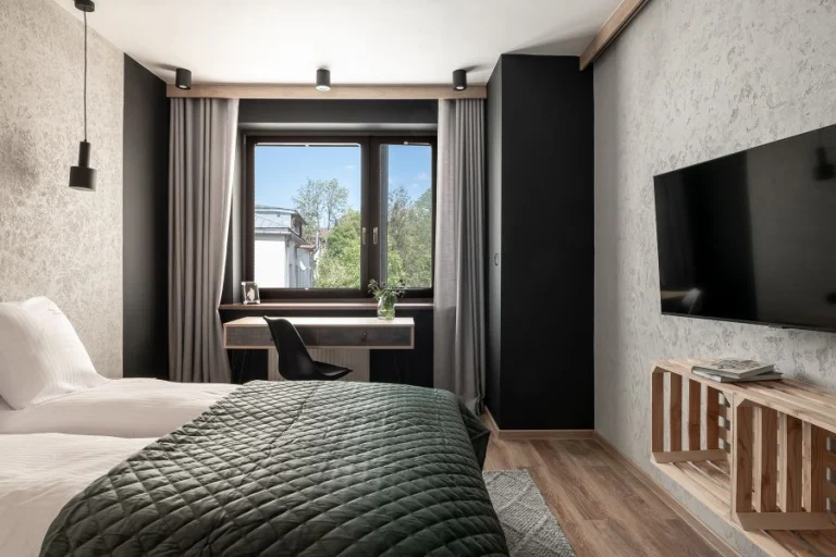 Wnętrze utrzymane jest w tonacji szarości i butelkowej zieleni. Naturalne drewno, ciekawe tapety i przytulne materiały tworzą klimatyczną przestrzeń idealną na wypoczynek w Zakopanem. -