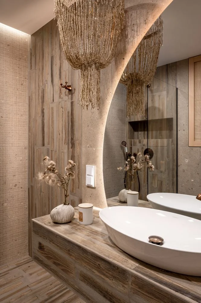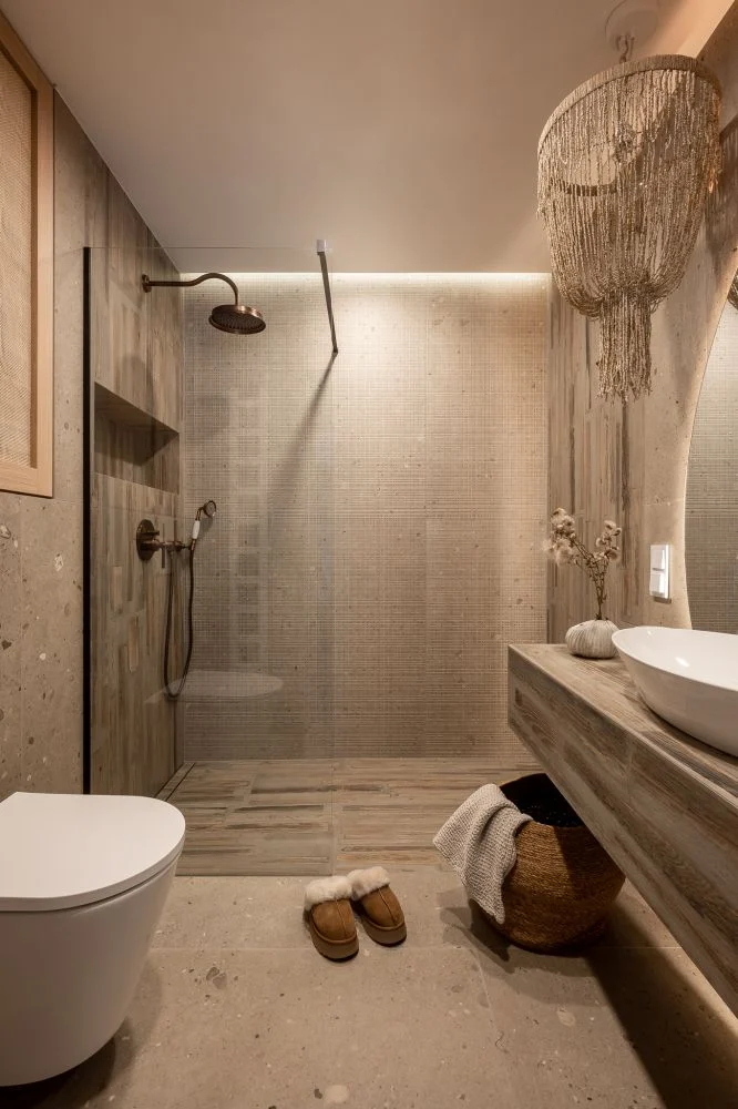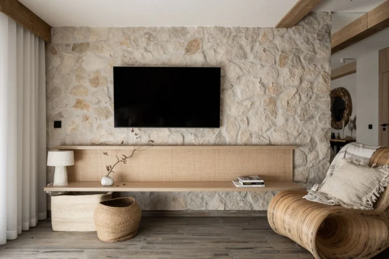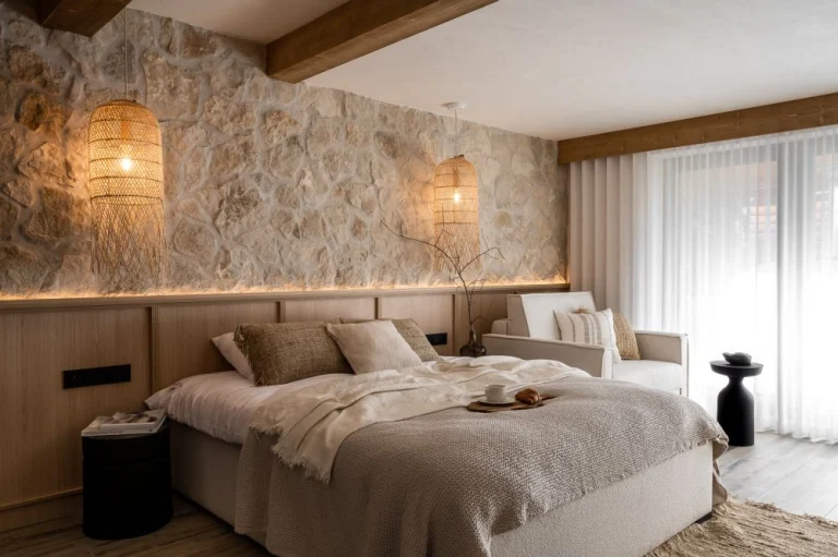 W aranżacji wykorzystano naturalny kamień, surowe drewno i rattan. Materiały te podkreślają organiczny charakter wnętrza i wspierają kojący klimat wypoczynku. -