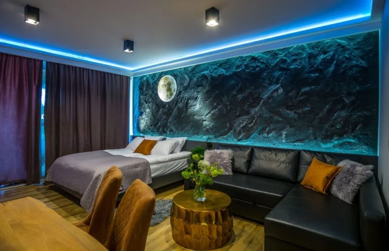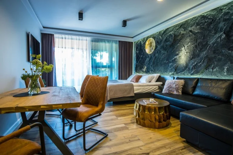 Studio MOON wyróżnia się księżycową atmosferą wnętrza, dużym tarasem przy zieleni oraz bezpłatnym dostępem do strefy relaksu (jacuzzi, sauna fińska i infrared). Dodatkowo goście mają do dyspozycji aneks kuchenny, łazienkę i garaż podziemny.